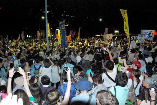 いつもの金曜日デモが7.29(日)に行われ、正門前に続々と人が集まってきた。太陽が沈み始めると、人々は、手に手にろーそくを持ち再稼働を叫び始めた。先頭の国会前集会では、国会の各全政党派の代表も参加していた。正門前は、7時半頃には、解放区になっていた。