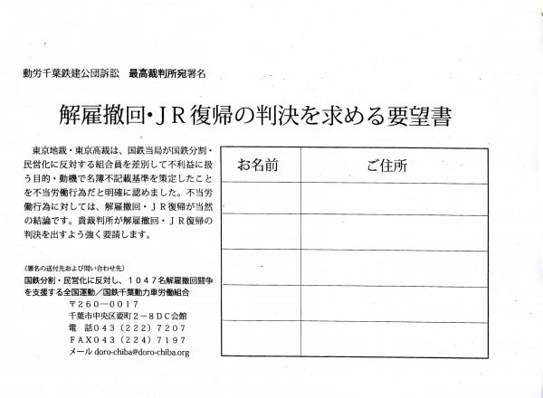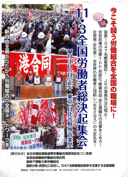 1047名解雇撤回闘争の勝利をめざす動労千葉の鉄建公団訴訟で9月25日、東京高裁(難波孝一裁判長)は、動労千葉争議団9人の「解雇撤回・JR復帰」の訴えを退ける反動判決を下した。断じて許すことはできない。国鉄闘争全国運動は翌26日、呼びかけ人会議を開き、最高裁段階で絶対に勝利するために、「解雇撤回・JR復帰」の第2次10万筆署名運動を全国でさらに展開することを決定した。「今こそ全解雇者をJRに戻せ!」の声を全国に広げよう。その最大の突破口として、動労千葉、関西生コン支部、港合同の3労組と国鉄闘争全国運動が呼びかける11・3全国労働者集会の1万人大結集に向け、なんぶユニオンは署名運動と11.3集会参加呼びかけに全力をあげます。