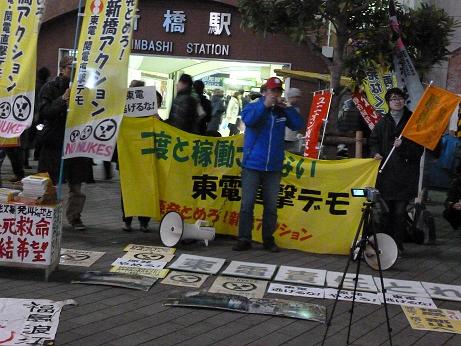 12月12日新橋アクションは、16時半から東電申し入れ行動を行った。申し入れ書は、フクシマNAZEN、国労新潟駅連合分会、NAZENにいがた、茨城・水戸金曜行動有志、原発なくせ!ちばアクション、NAZEN杉並、8.6ヒロシマ-8.9長崎反戦反核闘争全国統一実行委員会、NAZEN品川、東京・中部労働組合交流センター、なんぶユニオン、ユニオン東京合同、新橋アクションなどから集まり、それぞれ朗読して東電広報部に手渡した。その後17時半から新橋駅にて福島・希望の牧場の吉沢正巳さんを中心にしてリレートークを行った。吉沢さんのトークは、情熱と迫力があり、新橋駅広場の人々を釘付けにし、聴衆の輪が広がった。そして19時から東電直撃デモを行った。デモが新橋駅にもどったとき、リレートークの時にいた聴衆の一人が、待ってて、手を振ってくれた。又、国会金曜行動に参加している人など、新しい人もデモと交流会に参加した。とても充実したアクション行動でした。