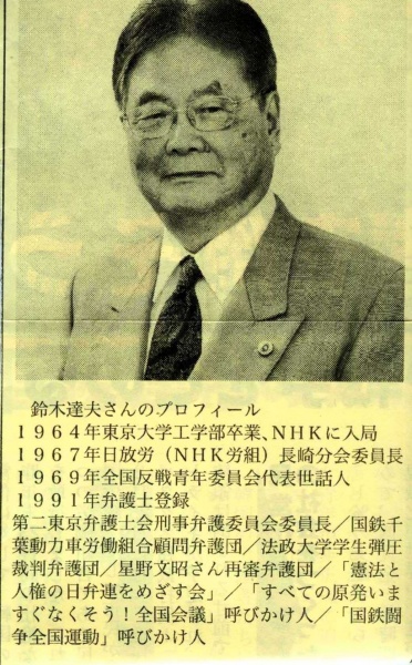 1月14日、「憲法と人権の日弁連をめざす会」の鈴木たつお弁護士が東京都知事選挙(1月23日告示、2月9日投開票)への出馬を表明し、東京都庁で記者会見を行った。「1千万人の怒りでアベ倒そう! 改憲・戦争・人権侵害を許さない!」を掲げ、鈴木さんは鮮烈に登場した。会見は高山俊吉弁護士が司会を務め、森川文人弁護士も同席した。