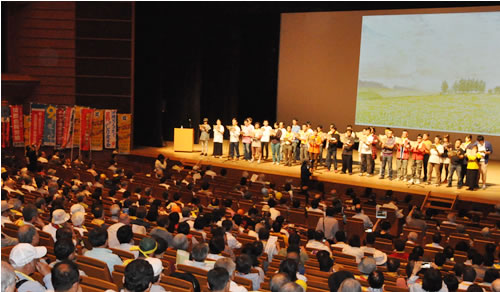 集会では、今年新たに結成された星野救援会である兵庫と杉並・高井戸の会の挨拶から始まり、平良牧師の講演、アメリカからの連帯メッセージ、韓国の拘束労働者後援会のビデオメッセージなどが上映され、地元四国の青年を先頭に全国の青年労働者が壇上に勢ぞろいし、星野暁子さんの詩を群読した。そして、最後に青年たちの思いを込めて「再び近づく戦争の足音、戦争は二度と繰り返させない」「星野さんを取り戻すということは自分自身を取り戻すこと、だから絶対に取り戻したい! 取り戻そう! こんな社会も変えよう!」と呼びかけた。星野さんの存在と闘いが世代を継いで青年たちの確信となっている。