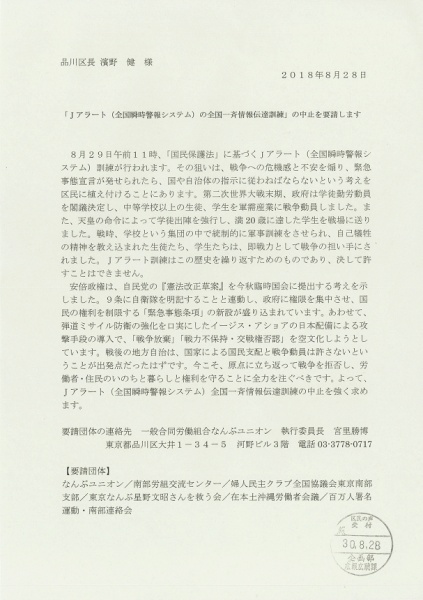 品川区長は、このJアラート(全国瞬時警報システム)全国一斉情報伝達訓練をやろうとしています。私たちは、これを見過ごすことはでできません。断固中止の申し入れを行いました。いつのまにか既成事実化させてはいけません。今後も声を国民全体で反対していきましょう。
