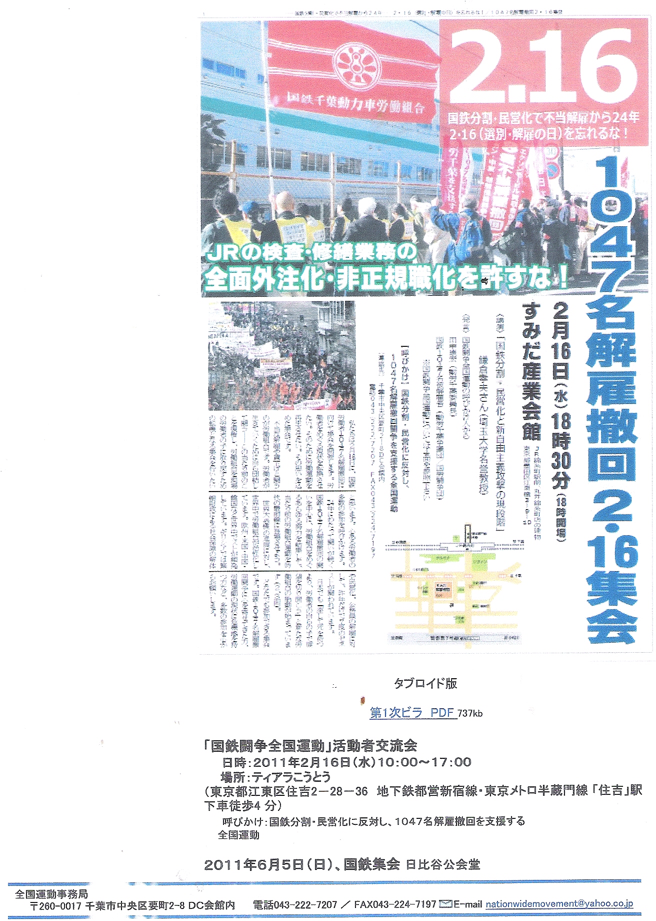 2月16日(水)18時30(18時会場すみだ産業会館・JR錦糸町駅前、丸井錦糸町店の建物)において、職場での怒り、困難、団結、感動の思いをひとつにする集会があります。青年労働者の半分が非正規、今年の大卒の就職が70%、職場では、退職強要、リストラがあたりまえの世の中、人間らしく生きられる社会が、企業(資本)によって破壊されています。菅政権は、その資本と、既存の大企業に屈服している労働働組合の腐敗した指導者と手をくんで、さらに労働者を苦しめる政治を行っています。このような政治状況、労働状況に対して、先頭にたって闘っているJR労働者(動労千葉など)を中心に全ての闘う労働者が団結し、労働者の生きる権利をまもり、闘う組合に作り替える労働運働をつくりましょう。社会をつくり直す原点が、労働組合の復権です。エジプトの闘いも既存の労働組合を倒し、新しい労働組合ができて、あの闘いができたとのこと。我々も、同じように、労働者を守る労働組合をつくり、資本のやりたい放題を許さず、労働者を苦しめている菅政権を打倒しよう。