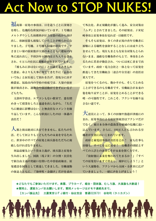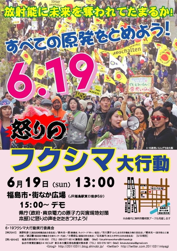 6・19怒りのフクシマ大行動になんぶユニオンは参加します。6・5国鉄集会において「福島のお母さん達の声」を聞けば、東京で、全国で「原発とめろ!」の大運動に積極的に参加したいという気持ちになります。