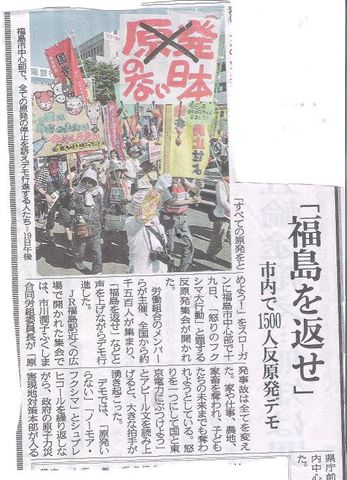 福島市街地で、1500人の集会とデモが、大成功。我が組合員も参加。東電や政府の幹部がいる現地対策本部や、東北電力にむけたデモだった。地元の学生やこども連れの女性など、多数が飛び入り参加。商店街の人々、通行人、マンションの窓から手を振る人々がいて、デモをやっている我々も元気がでました。被曝させられ、健康も、仕事も、故郷も未来もふみにじられ続けている人々の怒りが、本当に伝わってきた、感動的なデモでした。