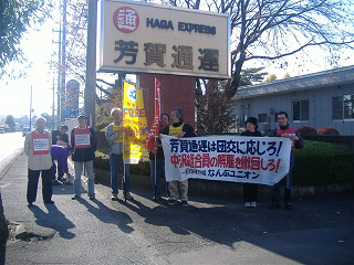 11月24日我々なんぶユニオンと部落解放同盟全国連合会・品川支部と杉並支部、とちのきユニオンは、芳賀通運本社前にて団交を申し入れと抗議行動を行った。我々の代表が団交の申し入れをしたが、会社側は社長、と取締役布施は、留守であった。代わりに総務部長が申し入れ書をしぶしぶ受け取った。その後社前で一時間抗議集会を開いた。参加者全員が発言した。会社の労働委員会でのデタラメな嘘の証言を批判弾劾し、昼休み中の労働者に芳賀通運は、ひどい会社であることを暴露して、最後まで闘うことを主張して社前集会を終わらせた。