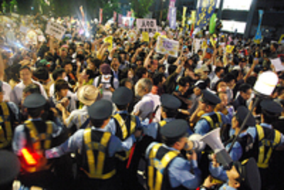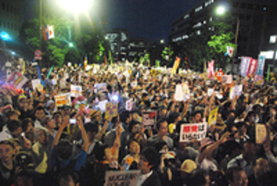 「再稼働反対!」「再稼働反対!」の激しいコールが地鳴りのように響いた。手作りのボードやプラカードを掲げて若者・年輩者・女性・男性、あらゆる世代の人が集まった。6月29日夜、20万人(主催者発表)の労働者民衆が首相官邸前を埋めた。それより前、午後5時を過ぎると地下鉄の出口からひっきりなしに人が出てきた。日比谷方向や赤坂方向からも絶え間なく人が集まってきた。次第に歩道から車道に人があふれ出し、午後7時半近くなって、首相官邸前の交差点から財務省前にいたる数百メートルの、両方向合わせて6車線の道路が完全に人で埋まった。官邸前は労働者民衆によって占拠された。エジプトのタハリール広場占拠が東京で再現された瞬間だ!